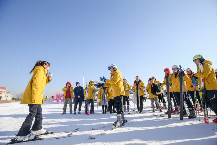 當自由式滑雪空中技巧世錦賽冠軍程爽從雪道頂端一躍而下,閃亮登場,整場活動達到高潮。程爽現場分享了自己運動生涯的精彩故事,并以滑雪冠軍教練的身份為在場嘉賓講解滑雪技巧、親自示范,引導他們開啟人生中的首次滑雪體驗。