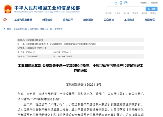 2022年1月12日,工業和信息化部聯合公安部發布了《關于進一步加強輕型貨車、小微型載客汽車生產和登記管理工作的通知》(以下簡稱“藍牌新規”)。通知對輕型貨車的技術參數做了明確要求,例如發動機排量不大于2.5L、輪胎名義斷面寬度不超過7.00in(英制)、貨廂內部寬度不大于2100mm等,并對車輛公告、上牌、生產、監督等環節加大約束力度,力求從產品源頭有效消除輕型貨車“大噸小標”、超載運輸隱患。