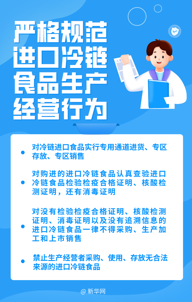 發布會上,市場監管總局食品經營司副司長黨倩英介紹,市場監管部門嚴格落實國務院聯防聯控機制“人物同防”的工作要求,采取多種措施,嚴密防范新冠病毒通過進口冷鏈食品輸入的風險。其中,嚴格規范進口冷鏈食品生產經營行為尤為重要。