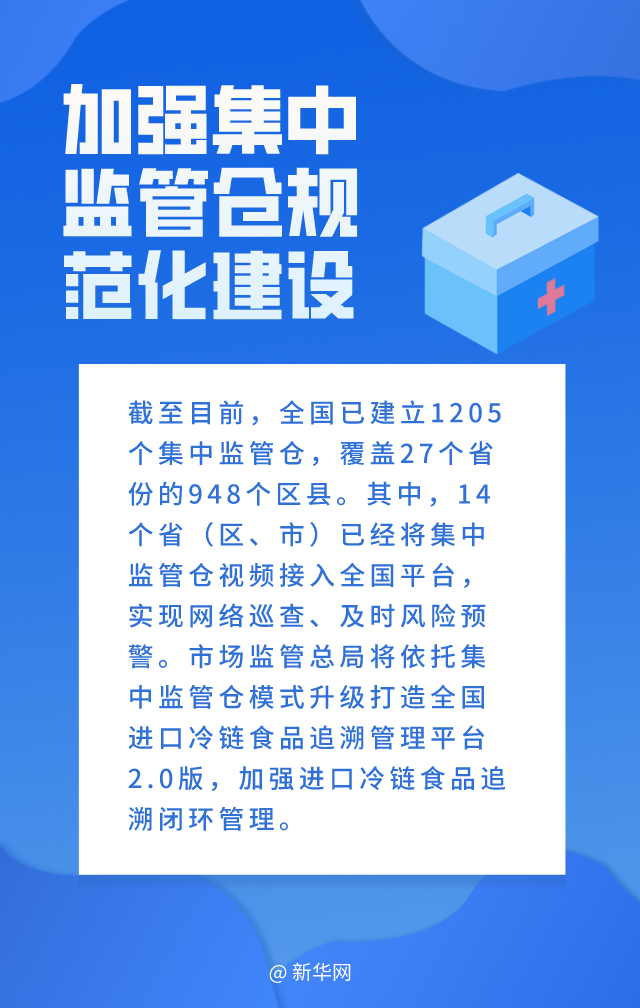 截至目前,全國已建立1205個集中監管倉,覆蓋27個省份的948個區縣。其中,14個省(區、市)已經將集中監管倉視頻接入全國平臺,實現網絡巡查、及時風險預警。市場監管總局將依托集中監管倉模式升級打造全國進口冷鏈食品追溯管理平臺2.0版,加強進口冷鏈食品追溯閉環管理。