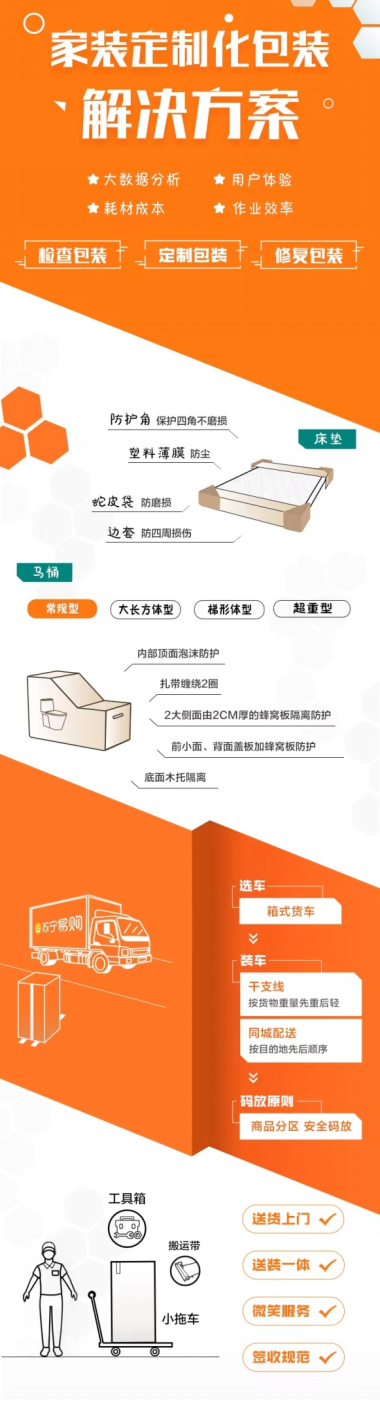 以床墊為例,蘇寧易購物流通過聯合商家增加邊套、防護角等包裝,保護床墊四周及四角不磨損;通過給衛浴潔具產品打木架,保障運輸安全。值得一提的是,蘇寧易購物流推出的定制化解決方案,會根據商品屬性優化裝車策略、碼放規則,服務工程師在送貨上門過程中還匹配專業綁帶,以送裝一體服務,保障用戶體驗。