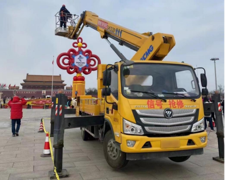 為了迎接冬奧會及中國傳統節日春節,營造隆重熱烈的氛圍,天安門廣場上搭建了“精彩冬奧”為主題的花壇,以中國結為主景,花壇頂高17米,為五環環繞在一起并嵌有雪花圖案,寓意五洲同慶冬奧會。在“精彩冬奧中國結”花壇搭建任務中,歐馬可高空作業車專業出擊,以不負所托的載重能力、精益求精的操作系統和超能持久的續航能力,保障冬奧高空作業更安全、高效、圓滿地完成搭建任務。