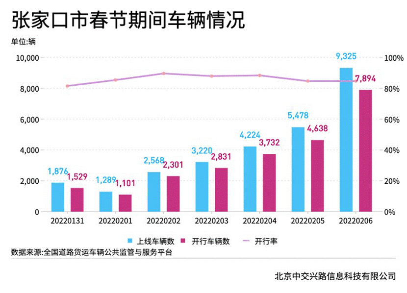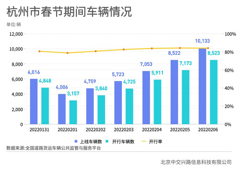 貨運平臺的數據顯示,今年春節期間,黑龍江牡丹江貨車車輛上線數達到2660,開行率達到70%以上。新疆伊犁春節期間貨車車輛上線數21588,開行率接近80%。浙江杭州貨車車輛上線數46212,開行率超過80%。上述地區春節期間接近80%的貨車開行率,極大保障了當地抗疫和民眾生活的物資需求。