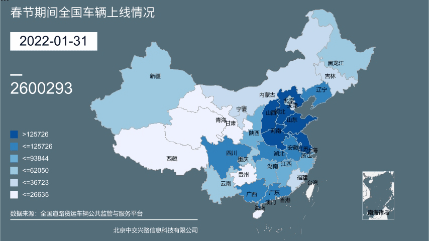 作為我國12噸以上重載貨車的國家級監管平臺,貨運平臺積極響應國家春運相關保障工作部署,在春節期間對全國重型普貨車輛(半掛牽引車和總質量為12噸及以上普貨車輛)提供安全監管服務。在貨運平臺的建設和運營單位中交興路技術助力下,貨運平臺對在春節期間運行的重點車輛安全風險實時推送定向提示,護航車輛貨運安全,為抗疫和冬奧會的順利進行提供了安全保障。