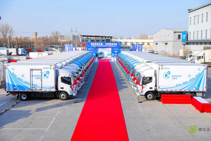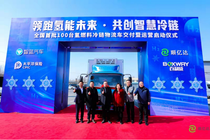 3月3日,在位于北京大興區的百利威物流園區內,一場對于氫能源商用車行業發展的具有重要意義的活動隆重上演——全國首批100臺智藍氫燃料冷藏車交付順億達智慧運力平臺并正式啟動運營。