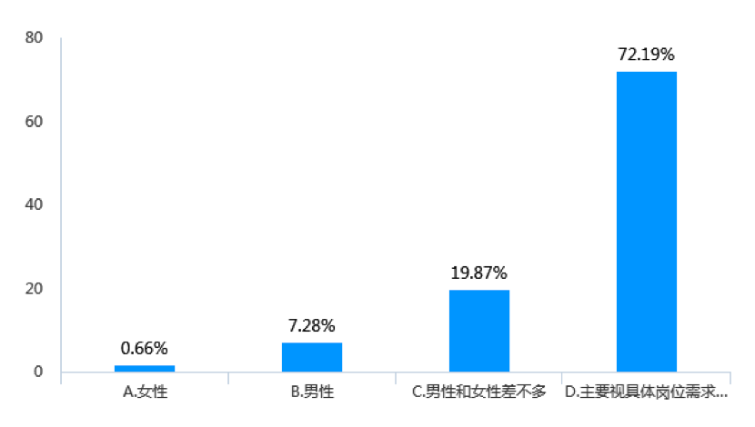 物流行業(yè)作為勞動(dòng)密集型的服務(wù)業(yè),不同崗位工作內(nèi)容差別較大,由此決定男女從業(yè)者不同的職業(yè)發(fā)展路徑。這也決定了,物流企業(yè)在決定男女員工晉升時(shí),更多的會(huì)考慮到具體崗位的性質(zhì)。調(diào)查顯示,在決定人員晉升時(shí),有72.19%的企業(yè)會(huì)視具體崗位需求而傾向男女性別因素(見(jiàn)圖11)。