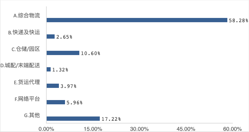 二是各種類型的物流企業(yè)全部涵蓋(見(jiàn)圖16)。其中,綜合物流企業(yè)最多,占比為58.28%;企業(yè)數(shù)量占比為17.22%居第二位的是其他類(具體包括專業(yè)性物流企業(yè)如危化品物流、汽車物流,以及供應(yīng)鏈管理、物流軟件、冷鏈、智能裝備等類型,且各類數(shù)量相對(duì)平均);企業(yè)數(shù)量占比超過(guò)10%的還有以倉(cāng)儲(chǔ)/園區(qū)為主業(yè)的企業(yè);其他類型則依次是網(wǎng)絡(luò)平臺(tái)、貨運(yùn)代理、快遞及快運(yùn)企業(yè),以及城市/末端配送類企業(yè)。