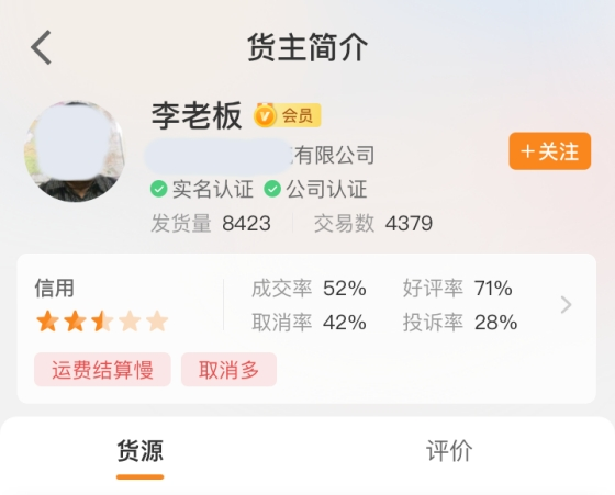 同時,平臺還將同步展示貨主的正負向標簽。結合信用分指標情況,信用等級高的貨主會展示正向標簽如:運費結算快、投訴少等;信用等級低或不達標的貨主則會在顯著位置展示負面標簽如:運費結算慢、取消多等。司機可以通過直觀展示的評價標簽進行判斷,更好的甄別優質貨主。