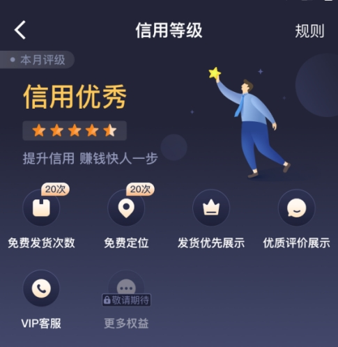 對于達到一定信用等級的貨主,平臺會給予榮譽認可及權益激勵,信用優秀的貨主將獲得貨源優先展示、專屬客服、加贈發貨次數等權益,反過來,針對信用等級低和有違約行為的貨主,平臺也將進行相應的處罰和功能限制。