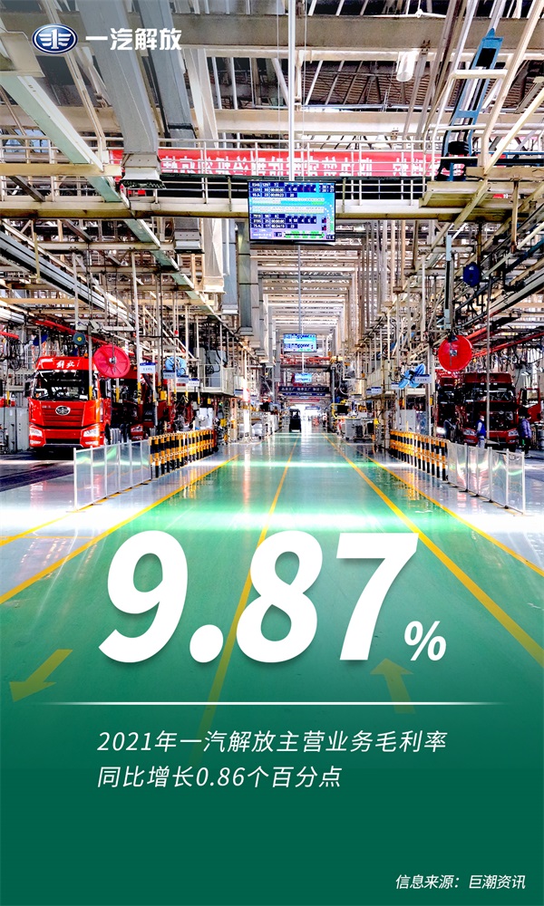 報告強調,2021年一汽解放實現營業收入987.51億元,利潤總額41.09億元,同比增長17.80%,歸母凈利潤39.00億元,同比增長45.97%,主營業務毛利率9.87%,同比提升0.86個百分點。公司擬向全體股東,每10股派發現金紅利6.50元(含稅),合計30.25億元(含稅),占歸屬于上市公司普通股股東凈利潤總額的77.57%。
