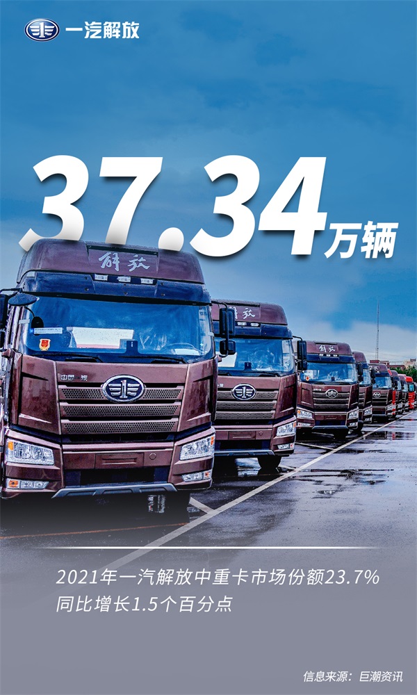 2021年,是“十四五”的開局之年,也是國六賽道的首戰之年。面對法規升級、需求波動等內外部環境變化與挑戰,一汽解放持續聚焦產品領航,全面優化產品組合,穩步提升國六產品成熟度,堅持創新驅動,突破一系列核心技術,加快推進“四劍客”生態服務、智能車示范運營,深入推進數智化轉型,優化供應鏈體系,完善制造布局。通過發布智慧動力域品牌、新能源戰略,讓一汽解放的民族品牌形象更加深入人心。全年實現整車銷售43.97萬輛,其中,中重卡銷售37.34萬輛,市場占有率23.7%,同比增長1.5個百分點。作為公司的核心業務,中重卡銷量實現全球“五連冠”,重卡銷量實現全球“六連冠”。