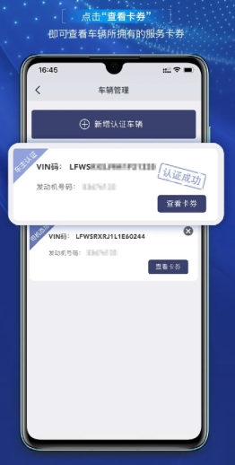 第二步:點(diǎn)擊“查看卡券”即可查看車輛所擁有的服務(wù)卡券。“免費(fèi)外出權(quán)益券”即代表該車輛具備免費(fèi)上門服務(wù)權(quán)益,服務(wù)站人員將前往您的指定地點(diǎn)提供服務(wù);“免費(fèi)四輪定位權(quán)益券”(共1張);“免費(fèi)預(yù)防維護(hù)券”(共3張)即代表該車輛具備免費(fèi)預(yù)防性服務(wù)權(quán)益。