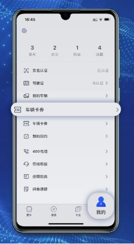 第一步:用戶在“解放行”APP綁定車輛后,選擇“我的”頁面,點(diǎn)擊“車輛卡券”選項(xiàng);