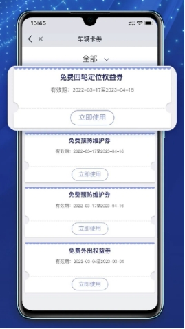 第三步:使用時(shí),在解放行APP報(bào)修,點(diǎn)擊“立即使用”,向服務(wù)站人員出示二維碼進(jìn)行卡券核銷。
