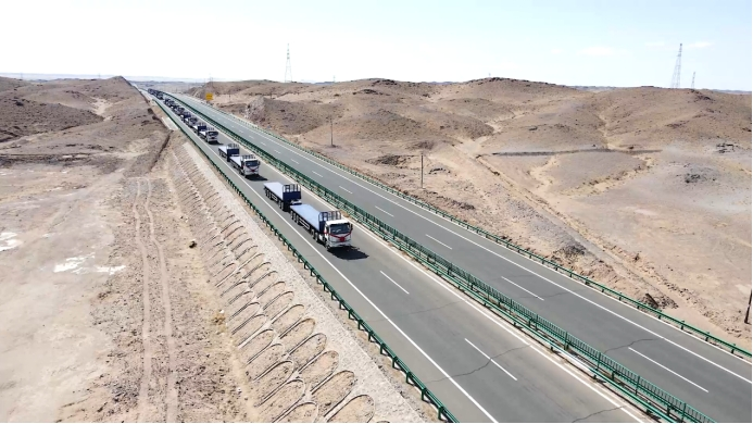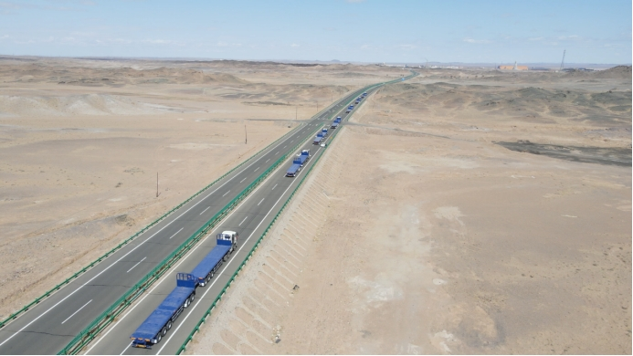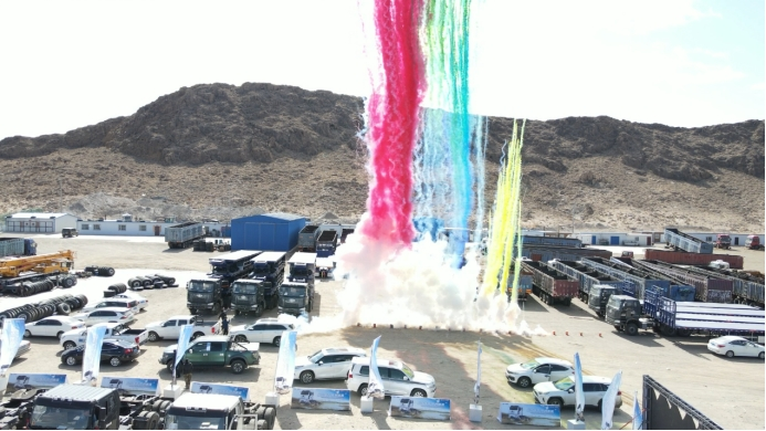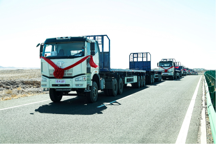 在所有嘉賓卡友的注視下,烏拉特中旗鋮源貿易有限責任公司董事長徐向成、汾陽市瑞通能源有限公司駐內蒙口岸總經理宋瑞琪、一汽商用車海外營銷部蒙古辦事處經理衣中偉等領導共同登臺,一汽商用車海外營銷部蒙古辦事處經理衣中偉 將代表著“中國制造”高品質的車鑰匙與精美車模交于烏拉特中旗鋮源貿易有限責任公司董事長徐向成、汾陽市瑞通能源有限公司駐內蒙口岸總經理宋瑞琪,伴隨著熱烈的掌聲,縈繞著現場的熱情,209輛J6P6x4牽引車正式啟程,在國際貿易的廣闊大道,行出解放品牌的鏗鏘車轍,展示中國制造的強勁力量。