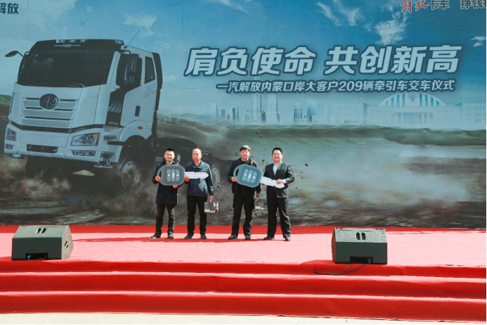 2022年4月1日,“一汽解放內蒙口岸大客戶209輛牽引車交車儀式”于內蒙古甘其毛都口岸圓滿舉辦,一汽商用車海外營銷部蒙古辦事處經理衣中偉 , 烏拉特中旗鋮源貿易有限責任公司董事長徐向成,汾陽市瑞通能源有限公司駐內蒙口岸總經理宋瑞琪、副總經理趙俊賢等蒞臨現場,共享盛舉,同啟華章,見證了209輛解放明星產品————J6P6x4牽引車的正式交付。