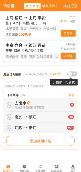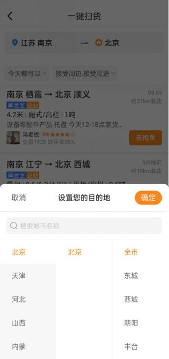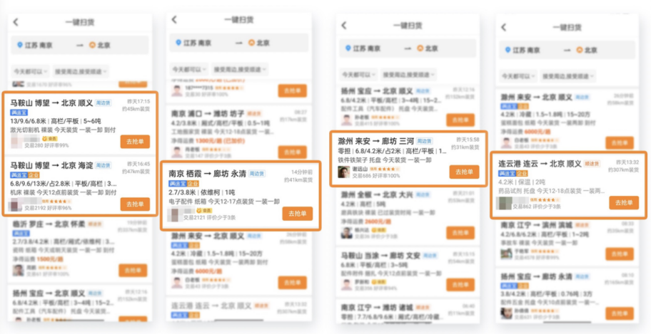 以南京-北京為例,通過“一鍵掃貨”功能,司機(jī)能額外看到南京周邊到北京、南京到北京周邊、南京周邊到北京周邊、南京出發(fā)到連云港裝貨送往北京的貨源
