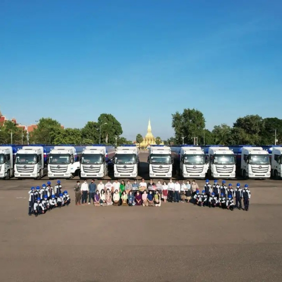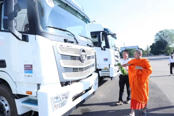 在佛教文化底蘊濃厚的老撾萬象,一位虔誠的僧人站在搭載福康動力的歐曼EST車陣前,為車輛所在車隊祈福。這其實是老撾油氣運輸公司重卡產品交付現場,數十輛搭載福康動力的半掛油罐車和牽引車即將交到客戶手中,重點用于當地成品油長途特種運輸。