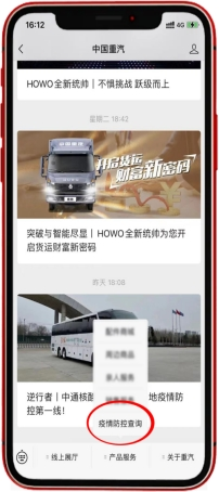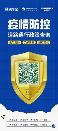 此外,中國重汽在為卡友提供愛心物資的同時,為幫助廣大卡友第一時間掌握各地疫情防控政策,合理規劃行程,聯合中國物流與采購聯合會、貨車寶,為廣大卡友提供全國貨車疫情防控政策查詢工具,并在中國重汽(微信號:cnhtc-sinotruk)、中國重汽銷售部(微信號:sinotruksales)、中國重汽汕德卡(微信號:cnhtc-sitrak)三大官方微信公眾平臺開通查詢通道。