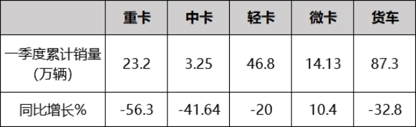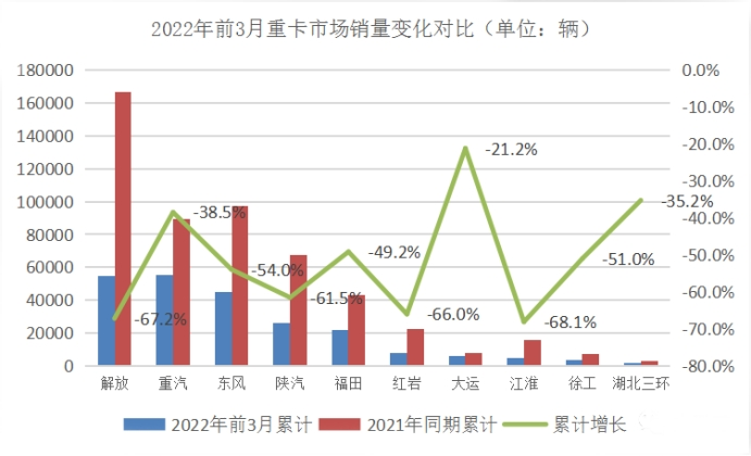 2022年的重卡市場,在“凜冬將至”的預言中艱難起跑,受全球經濟下行、俄烏沖突升級、國內疫情多點散發、燃油價格持續飆升以及車多貨少等不利因素疊加影響,一季度國內重卡累計銷量為23.2萬輛,同比去年的53.1萬輛,下降了56.3%。