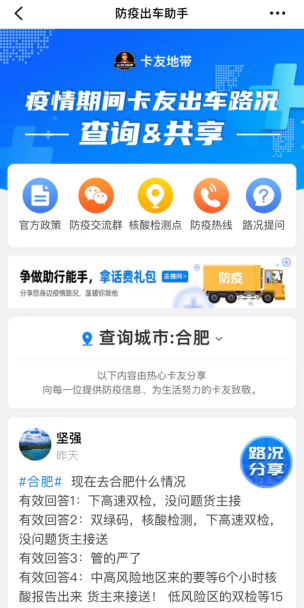 為守護疫情下受困的卡友,作為全國最大的貨車司機職業社區,卡友地帶也在第一時間行動起來。3月,卡友地帶推出針對貨車司機的新冠疫情隔離保障,免費發放新冠疫情隔離津貼保險共計8000余份;4月,卡友地帶開發上線“防疫出車助手”,幫助貨車司機及時掌握疫情動態與實時路況;4月14日,卡友地帶攜手合肥高新區總工會、合肥高新區道路運輸行業工會聯合會,看望慰問滯留合肥的貨車司機,并捐贈愛心物資包1000份……