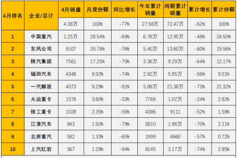 4月,國內重卡4.38萬輛的整體銷量,環比3月的7.7萬輛,下降了43%,較去年同期的19.3萬輛,下降了77%,對比歷史同期數據,是自2007年以來的銷量最低點。