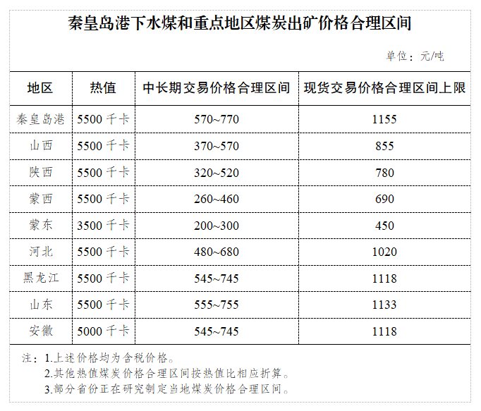 截至5月9日,除秦皇島港下水煤外,已有7省區(內蒙古分蒙東、蒙西兩個區域)明確了煤炭出礦環節中長期和現貨交易價格合理區間。具體水平見下表: