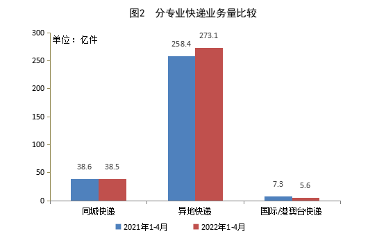4月份,郵政服務業務總量完成158.2億元,同比增長7.8%;郵政寄遞服務業務量完成22.0億件,同比增長4.1%;郵政寄遞服務業務收入完成28.6億元,同比下降6.4%。