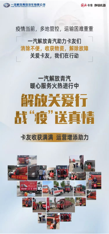 一汽解放青汽也是于4月17日-5月31日,針對(duì)受疫情影響區(qū)域內(nèi)的解放青汽車輛,開展全面保障工作,解決受困卡友的燃眉之急。此外,一汽解放青汽的工作人員更是深入服務(wù)區(qū)、高速口,無(wú)論駕駛?cè)魏纹放栖囕v卡友,均可享受解放提供的車輛檢測(cè)與維修、暖心餐等服務(wù),為卡友“戰(zhàn)疫”護(hù)航。