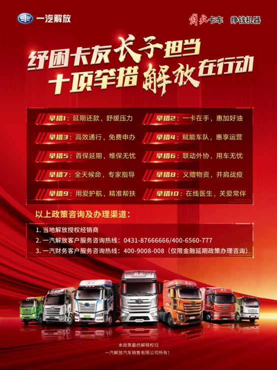 一汽解放作為國(guó)車長(zhǎng)子、行業(yè)龍頭企業(yè),始終堅(jiān)定不移履行央企政治責(zé)任、經(jīng)濟(jì)責(zé)任、社會(huì)責(zé)任。堅(jiān)持“以客戶為中心”的經(jīng)營(yíng)理念,始終與廣大伙伴風(fēng)雨同舟、并肩前行。面對(duì)行業(yè)逆境、渠道難點(diǎn)、客戶痛點(diǎn),緊跟國(guó)家一攬子“穩(wěn)經(jīng)濟(jì)”政策實(shí)施步伐,投入數(shù)十億元,推出6個(gè)月延期還本付息政策。并圍繞客戶運(yùn)營(yíng)全場(chǎng)景推出“卡友紓困十項(xiàng)舉措”,使廣大卡友能夠“安心購(gòu)、放心用”。為低迷的市場(chǎng)注入一針“強(qiáng)心劑”,恢復(fù)市場(chǎng)的信心和提升解放品牌影響力。
