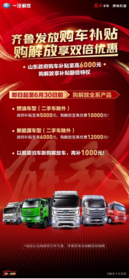 山東政府購車補貼至高享6000元,該利好政策持續到6月底!與一汽解放現行的福利疊加后,齊魯境內的卡友購車即可享受到“雙倍”優惠!機不可失!