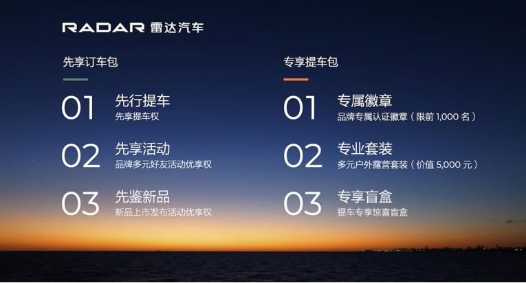 準車主福利進行時!雷達RD6將于今年上市,現在“0元預定”通道已開啟。首批預訂用戶,可享受優先提車權、品牌多元好友活動優享權、新品上市發布活動優享權等先享訂車禮包,還可獲得雷達汽車官方App品牌專屬認證徽章、驚喜盲盒、價值 5000 元的多元戶外露營裝備等專享提車禮包。即刻,開啟多元戶外精彩生活。