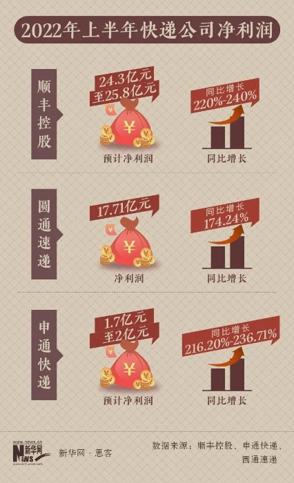 各大快遞公司也陸續(xù)發(fā)布上半年業(yè)績報告,顯示出市場整體回暖向好態(tài)勢。其中順豐控股(50.190, 0.40, 0.80%)實現(xiàn)凈利潤預(yù)計在24.3億元至25.8億元,同比增長220%至240%;圓通上半年實現(xiàn)凈利潤17.71億元,同比增長174.24%;申通也終于扭虧為盈,預(yù)計實現(xiàn)凈利潤1.7億元至2億元,同比增長216.20%至236.71%。