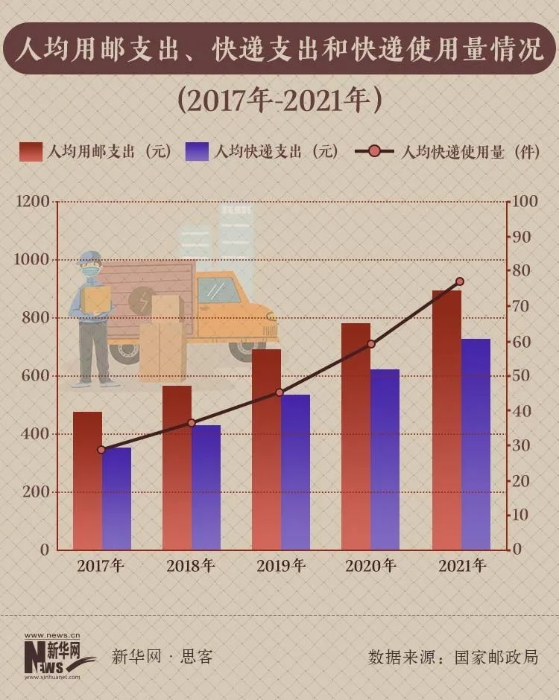 據(jù)國家郵政局?jǐn)?shù)據(jù)顯示,2017-2021年人均用郵支出、快遞支出和快遞使用量每年都在增長,其中2021年人均快遞使用量為76.7件,年人均用郵支出895.0元,年人均快遞支出731.4元。按照第七次全國人口普查結(jié)果14.12億人推測,2021年平均每人每月快遞量超過6個。