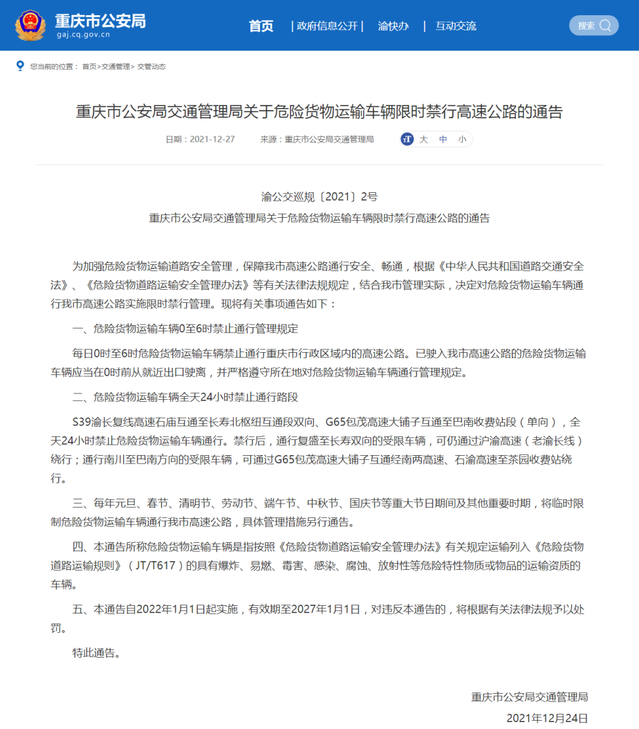每年元旦、春節(jié)、清明節(jié)、勞動節(jié)、端午節(jié)、中秋節(jié)、國慶節(jié)等重大節(jié)日期間及其他重要時期,將臨時限制危險貨物運輸車輛通行重慶市高速公路。