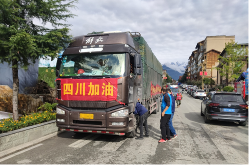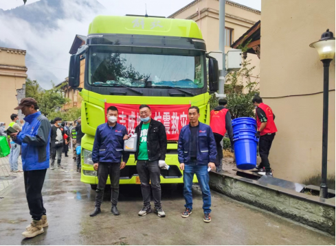 在地震發生后,位于甘孜的解放康巴金馬服務站沒有退縮,毅然選擇了“逆行”災區。第一時間組織籌備救災物資和提供救援服務,僅用一天的時間就籌備了110袋大米、110桶食用油、200多件飲用水等災區緊缺物資,挺進震中位置磨西鎮。