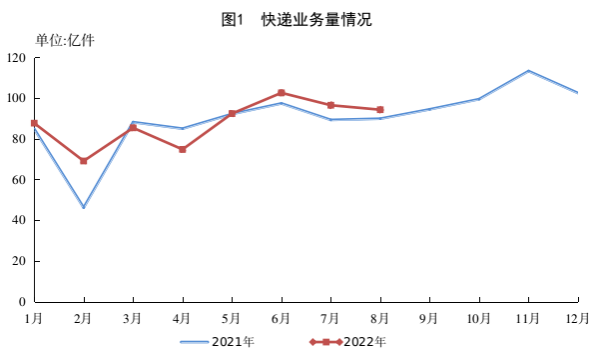 8月份,全國快遞服務企業業務量完成94.3億件,同比增長4.9%;業務收入完成883.9億元,同比增長5.2%。