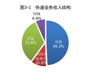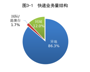 1-8月,同城、異地、國際/港澳臺快遞業務量分別占全部快遞業務量的12.0%、86.3%和1.7%;業務收入分別占全部快遞業務收入的6.6%、49.2%和10.8%。與去年同期相比,同城快遞業務量的比重下降1.2個百分點,異地快遞業務量的比重上升1.6個百分點,國際/港澳臺快遞業務量的比重下降0.4個百分點。