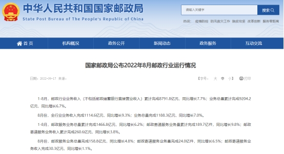 近日,國家郵政局公布了行業發展數據,1-8月郵政行業業務收入(不包括郵政儲蓄銀行直接營業收入)累計完成8791.8億元,同比增長7.7%;業務總量累計完成9204.2億元,同比增長6.7%。