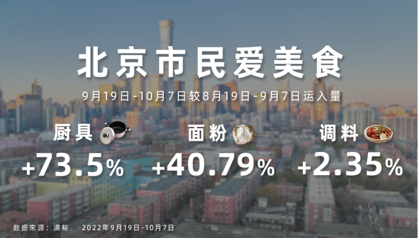 “唯有愛(ài)與美食不可辜負(fù)”,十一期間,人們進(jìn)可出行,退可廚房,在短視頻平臺(tái)加持之下,廚藝提升有了便捷路徑。其中烘焙備受追捧,精致濾鏡下渲染的美好畫(huà)面,入口后的綿軟香甜,甚至朋友聊天的話題選擇,種種因素使得這項(xiàng)廚藝格外吸引人。十一期間(數(shù)據(jù)分析時(shí)段為2022年9月19日至10月7日,下同),北京的廚具運(yùn)入量較上月環(huán)比增長(zhǎng)高達(dá)73.5%,面粉運(yùn)入量環(huán)比增長(zhǎng)40.79%,可謂把十一過(guò)出了年味兒。這或許可以體現(xiàn)南北方飲食習(xí)慣差異,從數(shù)據(jù)來(lái)看,相比之下,主要以大米為主食的上海、廣州、深圳,面粉運(yùn)入量則無(wú)大幅增長(zhǎng)。