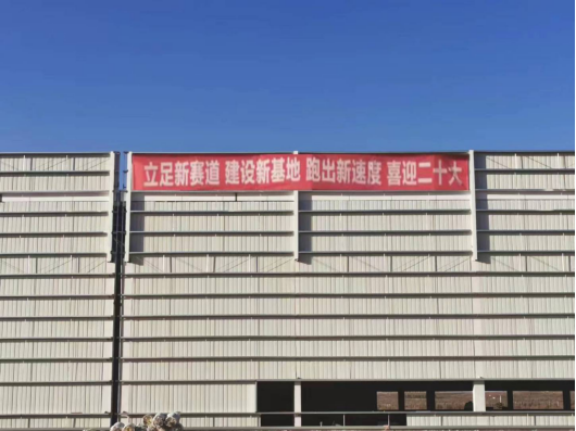 在內蒙古自治區鄂爾多斯市伊金霍洛旗的上汽紅巖新能源重卡基地現場,“立足新賽道,建設新基地,跑出新速度,喜迎二十大”的橫幅分外醒目,工程施工井然有序,總裝車間正在進行墻面內板安裝、地坪施工及幕墻施工......