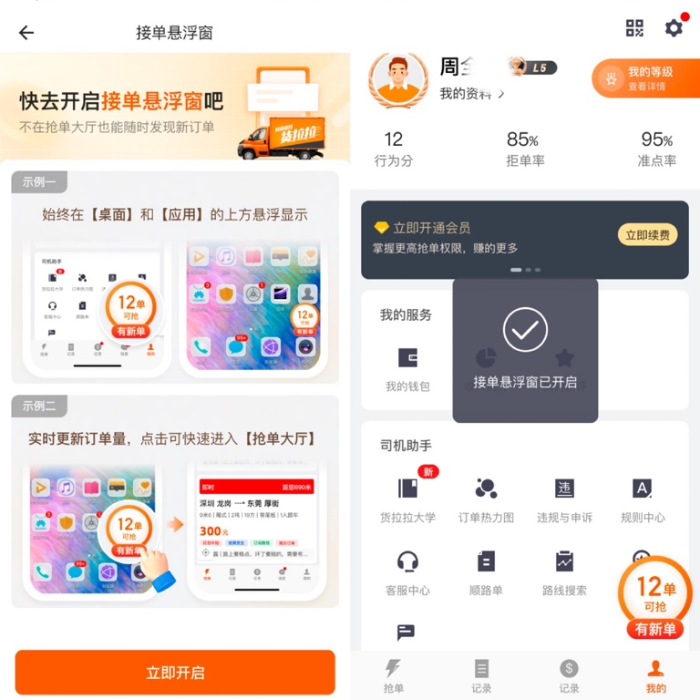 針對(duì)司機(jī)反饋“退出搶單大廳后訂單接收不及時(shí)、容易錯(cuò)過很多好訂單”等問題,今年8月起,貨拉拉上線懸浮窗功能。“懸浮窗開啟后,即便不在搶單大廳,也能收到來單信息,點(diǎn)開懸浮窗就可搶單接單。”廖師傅稱,“再也不用一直盯著搶單大廳刷新了。”