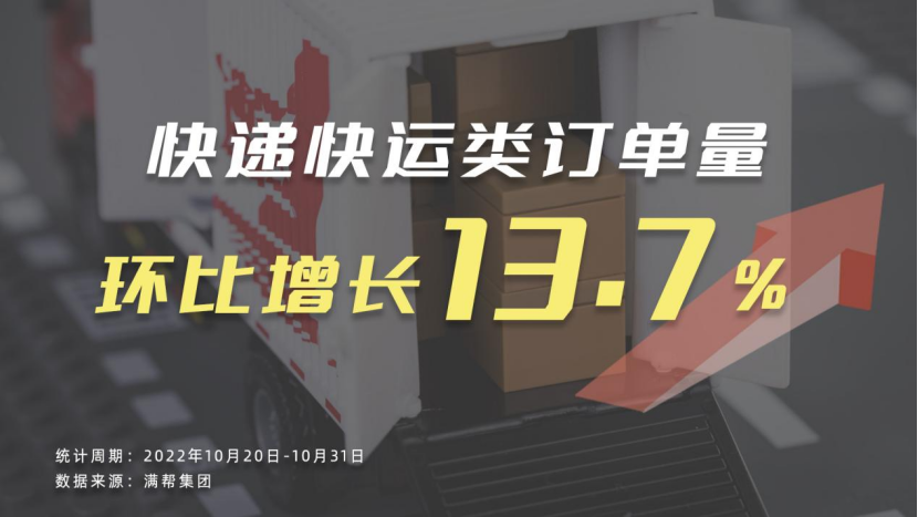 滿幫大數據顯示,2022年10月20日-10月31日,快遞快運類訂單環比增長13.7%。平均運距為930.87公里。不難看出,僅在預售階段,貨運量就呈現出了較高的漲幅,可見大家對雙十一的消費熱情遠超十一黃金周。