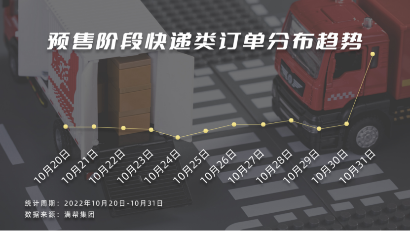 在預售階段,快遞類貨物的運輸峰值出現在哪天呢?滿幫大數據顯示,在預售階段的大部分時間里,貨運量均相對平穩,波動較小,而在10月31日則出現了較大增幅,將預售期的公路貨運量推到了最高點。毋庸置疑,“晚八人”為其做出了不少的貢獻。