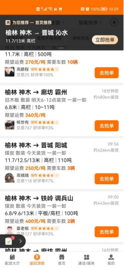 其實想要了解煤炭運輸的真相,我們可以在平臺上直觀地看到,里程在600-900公里左右,每噸價格基本維持在200-300元/噸;里程超過900公里,價格則會提升至300-400元/噸,里程越長價格越高。以滿載36噸,單程800公里為例,運費基本為10000-13000元左右。