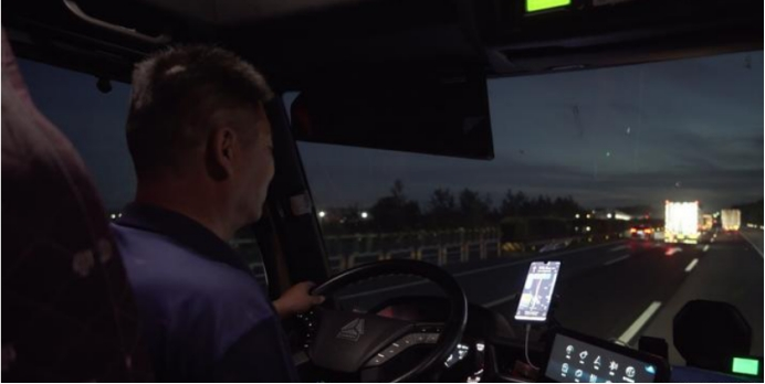 此后的幾個小時行駛,劉師傅為了排解旅途的寂寞打開了車輛的中控大屏,使手機互聯(lián)功能聽起了歌曲。劉師傅為了更加放松甚至脫掉了鞋子,很有點電影中賽車高手的樣子。