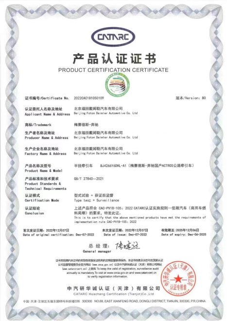 梅賽德斯-奔馳國(guó)產(chǎn)重卡Actros 6×4公路牽引車(chē)獲“低碳汽車(chē)(商用車(chē)燃料周期)”認(rèn)證證書(shū)
