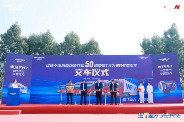 2022年12月27日,50輛豪沃TH7/WP14T/610馬力牽引車交車儀式在福建寧德隆重舉行。各方代表與媒體記者出席儀式,共同見證交車榮耀時刻。開啟新篇章,駛向新征程!