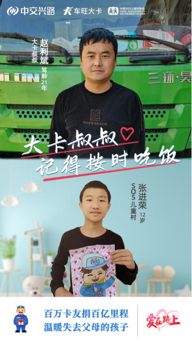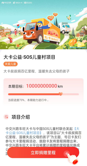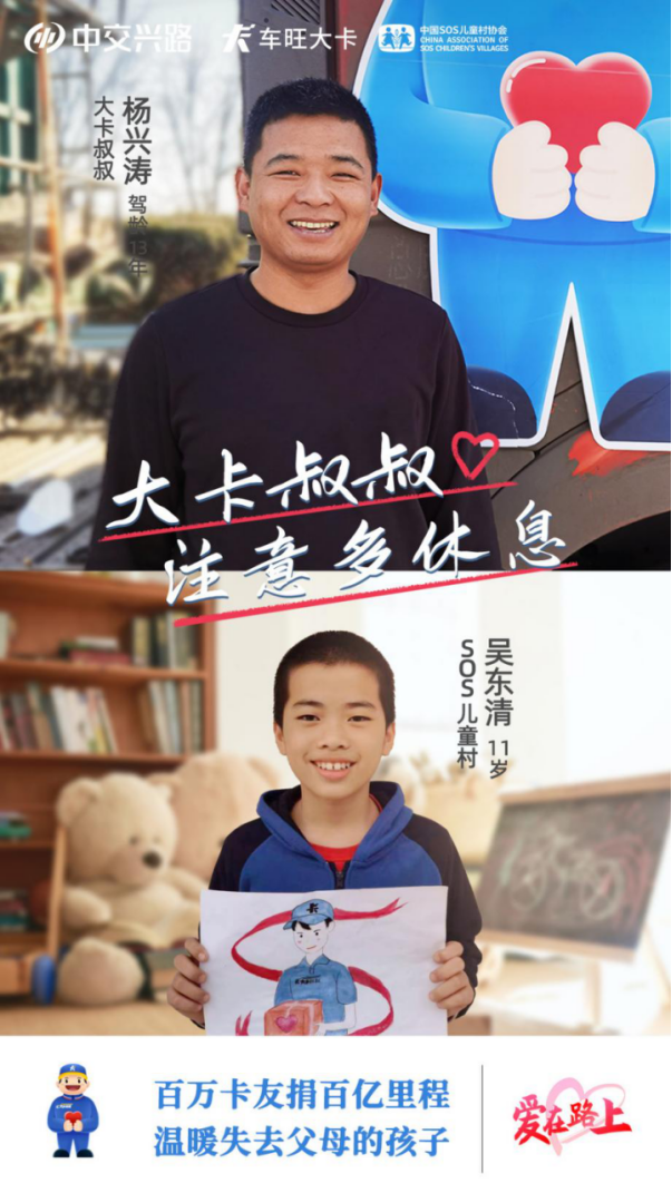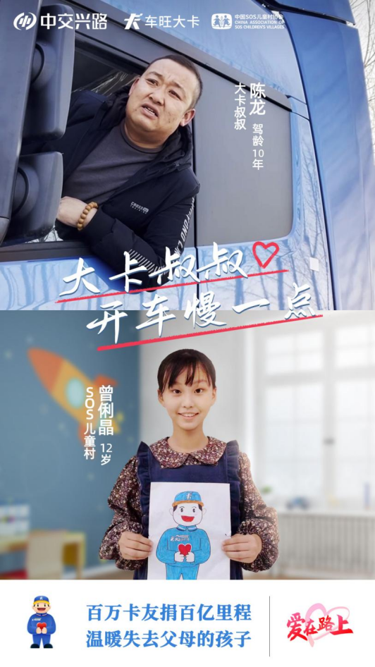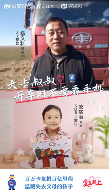中交興路車旺大卡作為服務(wù)于中小微運(yùn)輸企業(yè)、車隊(duì)和廣大司機(jī)群體的綜合性服務(wù)平臺(tái),持續(xù)關(guān)注貨車司機(jī)群體的急愁難盼問(wèn)題,讓貨運(yùn)的每一公里都有中交興路關(guān)愛(ài)的身影和陪伴。此次,發(fā)起“大卡里程捐·溫暖失去父母的孩子”,通過(guò)里程捐的方式,既是幫助卡友圈的孤兒離自己的夢(mèng)想更近,更是為SOS兒童村的孤兒送去溫暖,送去生活必需品。