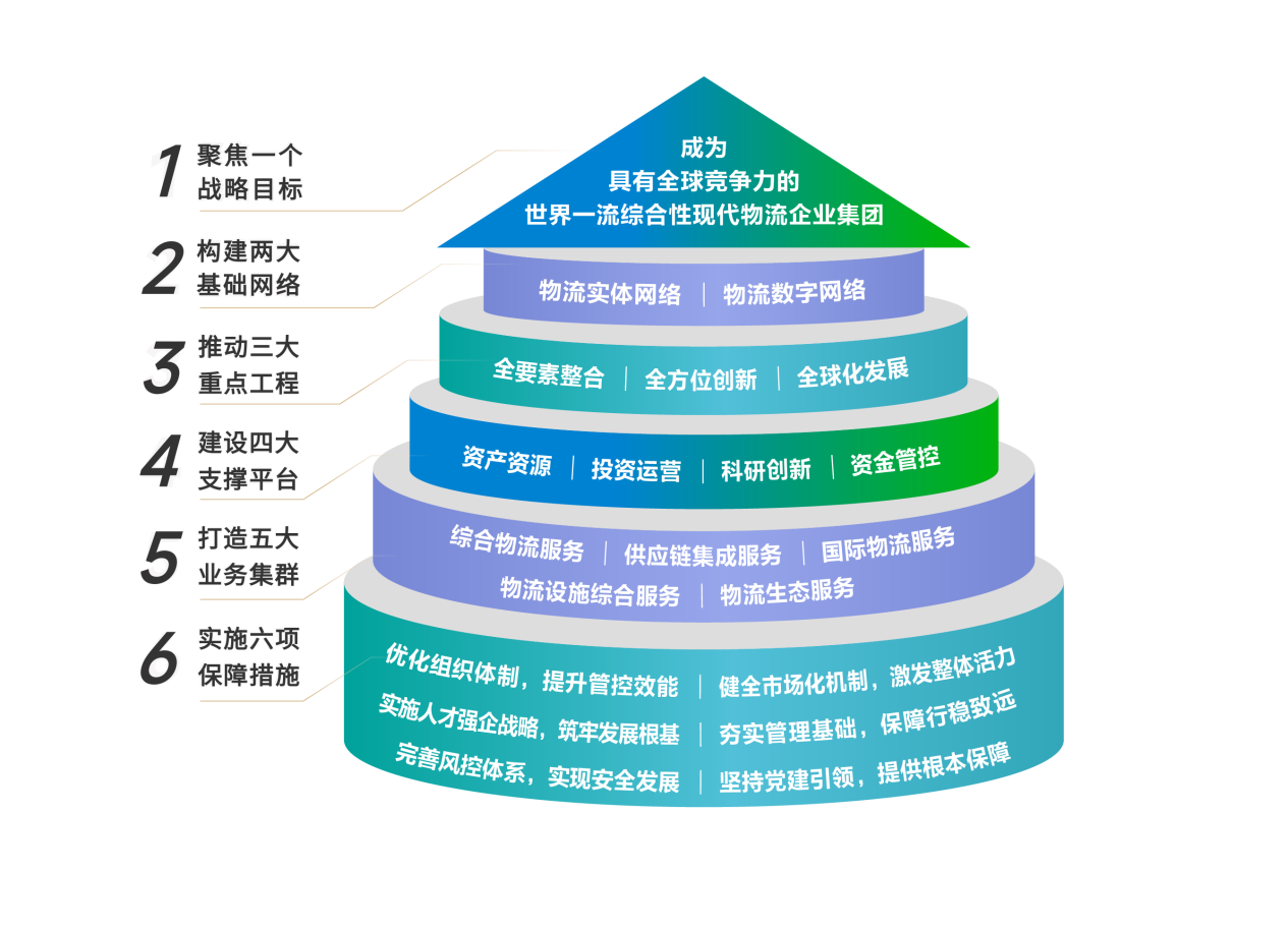 集團肩負“服務現代流通、保障國計民生”企業使命,將成為專業高效、值得信賴的世界一流綜合物流服務商作為企業愿景,已編制形成“123456”戰略發展規劃。